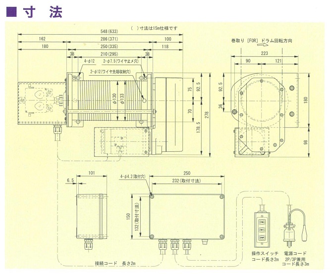 ■特徴 ●ドラムはエンドレス用ワイヤ止め2カ所式です ●ワイヤ先端の処理が簡単にできるように収納穴をドラムに設けました ●調整の簡単な揚程制御装置を標準装備しました ●本製品は屋内仕様、縦取付(ドラム上)です ●巻取り長さは10mです。オプションとして15m仕様もあります ![]() ![]() ■仕様