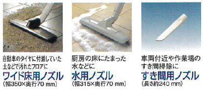 | ■特長 ①洗剤を含んだ水も吸えて、泡吹き出しなし ●ダストボックス内で泡を増やさない風の流れを採用。 ●排気口からの泡吹き出しを防ぐ「泡どめガード」つき。同時に必要以上の吸水時や転倒時にはフロートを上昇させ、モーターを守ります。 ②素早くしっかり吸い取る、パワフル260W ●乾湿両用型では最高レベルの260Wパワー。 ●大き目の砂や大量の溜まった水なども効率よく吸い込みます。 ③床面に広がる水をきれいに水切り ●2本のリップで水を前後から確実にとらえます。 ●ノズル幅がワイドになり、床面に広がる水や窓についた水滴などをすばやく集めます。 ![]() ■ゴミや用途に合わせて使い分け、ノズル3タイプ ![]() ■こんな場所におすすめ! ![]() ■仕様