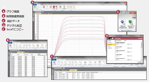 温度データロガーで、内部温度センサーにより、冷接点補正が自動でおこなわれ、精度が向上しています。 測定間隔は1秒間に4回からと、短い時間での温度測定を行うことが可能です。 |