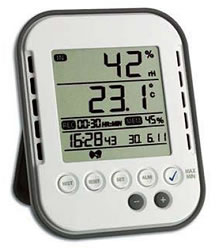 | ■特長 ●上下限温湿度アラーム付(独立) ●データロギング機能付き(50,000データ本体記録) ●アラーム発生時の時刻とデータを記録 ●最高・最低温湿度表示(時刻含む) ●露点演算機能 ●コントラスト調整付液晶表示 ●時計機能付き ●壁掛と卓上スタンドで使用 ■仕様