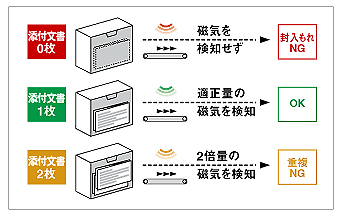 | ■特長 ●アルミ包材内の金属異物検出に 磁気反射方式により、アルミ包材内の金属異物を、異物の形状・向きによらず高感度に検出。ステンレス検出も高感度です。 レトルトパックやチョコレート、湿布薬など、アルミ包装された商品に最適です。 ![]() ●添付文書の封入検査に 能書などに磁気印刷を用いることで、封入もれだけでなく、重複もチェック可能。封入もれや2枚封入による煩雑な再検品作業をなくします。 ![]() ■共通仕様