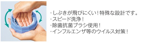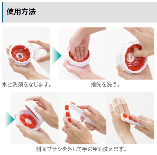 爪の中に入り込んだ汚れや、指の間など、手指の洗浄に効果的。 爪と指先が同時に素早く洗え、側面ブラシを取り外して手の甲のがんこな汚れも洗えます。 ラッカーやシンナーにも溶けず、100℃の熱湯で煮沸消毒も出来ます。 |