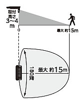 ■サイズ (単位:mm) ![]() ■センサー感知範囲 180度範囲内で働く人や車などを感知できます。 ![]() ■仕様