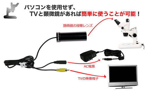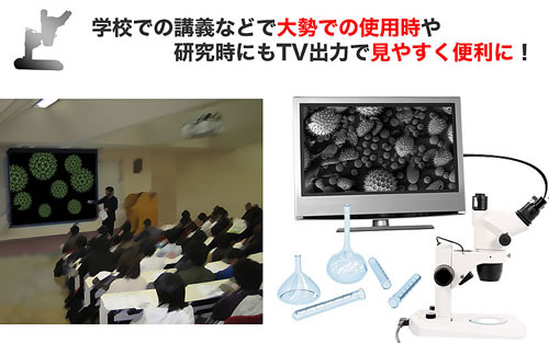 テレビ接続が可能なベーシックモデル(M1080DLP-M4112NT) 普通の顕微鏡を簡単にデジタル顕微鏡に さらにTVに出力可能です。 (M1080DET-MSTVT) USBマイクロスコープのオプションはこちら |