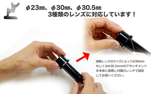 ■特徴 (M1080DET-MSTVT) ![]() お持ちの顕微鏡に取り付けることで、顕微鏡の覗いた映像をTVに出力することを可能にするのが、この「M1080DET-MSTVT」です。 使い方はいたって簡単で、顕微鏡とTVがあれば、すぐに使用することが可能です。 大学など学校の講義で大勢の前で顕微鏡を覗いた映像をTV出力してみんなに見せたり、TV出力することで研究が快適に。 ![]() ![]() ![]() ![]() ■TV出力で便利 学校などでの授業、講義で大勢で一台の顕微鏡を使用する際にこの「M1080DET-MSTVT」があれば、TVやモニタに出力できるので皆で覗いた映像を鑑賞することが可能になります。 一人で、研究作業をする際にもTV出力することで快適な研究ライフを送れることでしょう。 ![]() ■パソコンは不要です パソコンを使用せずに、顕微鏡とテレビやモニタがあれなすぐに使用することが可能です。 「顕微鏡の接眼連レンズ部にカメラをセット→ACアダプタを接続→TVと接続」これだけで準備完了です。あとは拡大したいものをセットすればテレビで観賞することができます。 ![]() ■φ23mm、φ30mm、φ30.5mmの3つに対応 この「M1080DET-MSTVT」はφ23mm、φ30mm、φ30.5mmの3つのサイズの接眼レンズ部に対応しています。 サイズを変更する時は各サイズのアタッチメントをはめて固定用のレンチでネジを閉めます。 ![]() ■仕様