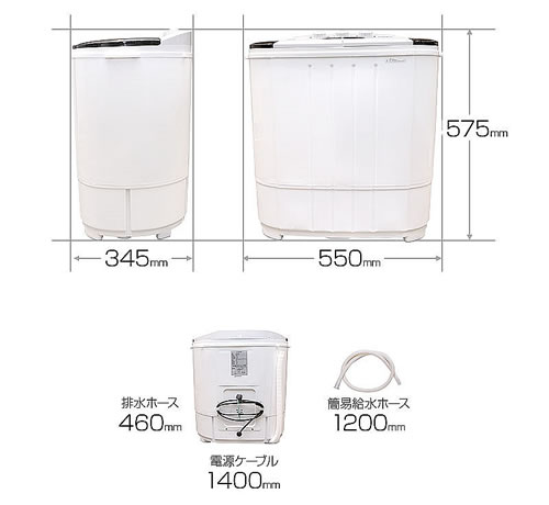 | ■特長 ●別洗い専用として使えるサブ洗濯機 他にも色落ち、色移りが気になる服、洗剤を使い分けたいベビー用衣類、服とは別のモップ専用など、別洗い用としてもう1台コンパクトなサブ洗濯機。 ![]() ●サブ洗濯機でも二槽式だからこそのパワフル洗浄&脱水 二槽式洗濯機の特長として、 ・ 洗いに特化したパワフル洗浄槽 ・ 汚れに合わせて強弱を選べる ・ 洗濯液や水を再利用して節水できる ・ パワフル水流で粉石けんがよく溶け泡立つ ・ 作りがシンプルで壊れにくい ・ 洗いと脱水を一度にできるので大量の洗濯物を洗える などなど…全自動洗濯機をあえて使わない二槽式洗濯機ファンがいるほどです。 ![]() ●洗濯容量約3.6kgの洗濯槽 洗濯槽底にあるパルセーターと言われる高速回転する羽根がパワフルな水流を作ります。 円形ではない角張った部分がある洗濯槽の中でその水流がさらに複雑になり、力強く洗濯物の汚れを落とします。 ![]() ●乾燥容量約2kgの脱水槽 ステンレス製でカビにくく、洗濯を回しながら同時に脱水もできます。 汚れたタオルや雑巾が大量に出た時でも、洗いながら脱水をすることで、大量の洗濯物を洗うことができます。 ![]() ●1人暮らし用のメイン洗濯機としても十分使える 1日にでる1人分の洗濯物の量は、およそ1.5kgとされています。 小型でも洗濯槽の容量約3.6kg、脱水槽の容量約2kgと、1人暮らし用として十分使える洗濯機です。 ●洗い方を自由に決められる使い勝手のよさ 簡単な操作パネルで洗濯のコースを、自分好みに自由に設定できます。 操作パネルには、 1.洗いタイマー 2.洗いコース 3.脱水タイマー の3つのツマミがあります。 3つそれぞれのツマミを回して時間とコースを選ぶだけ(給水は手動になります) 洗濯槽と脱水槽はそれぞれ個別に動作するので、洗濯を回しておいて同時に脱水をかけてと、洗濯時間を効率的に短縮することができます。 ![]() ●一般的な洗濯機サイズとの比較 一般的な洗濯機の平均サイズと比較すると、とてもコンパクトで小型になっているので、サブの分け洗い専用洗濯機にピッタリ。 空いているスペースに置きやすいコンパクトサイズ。 ![]() ■サイズ ![]() ■仕様