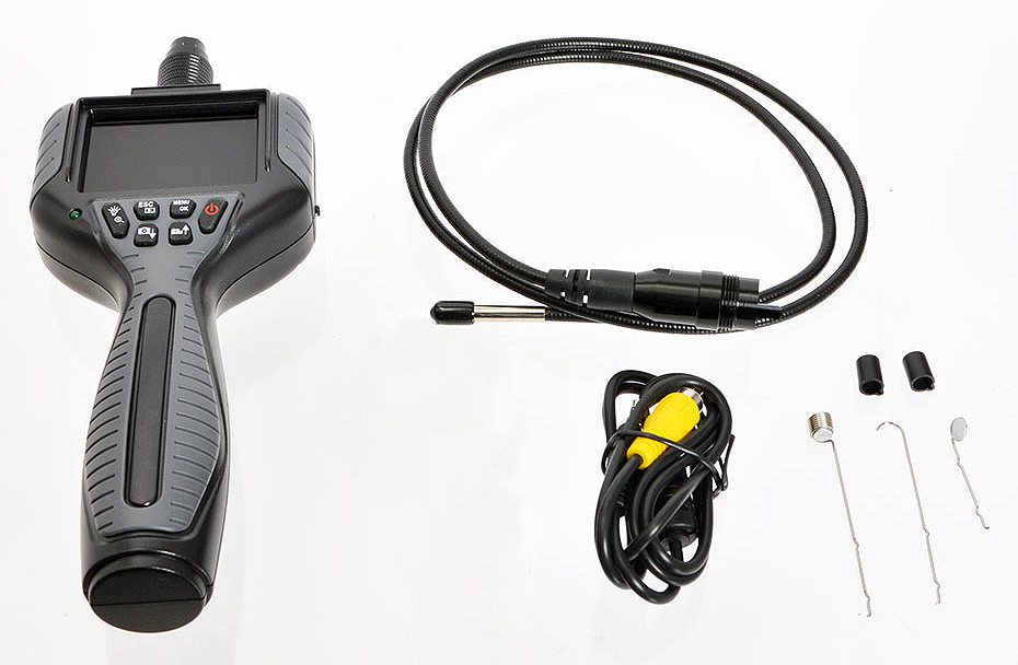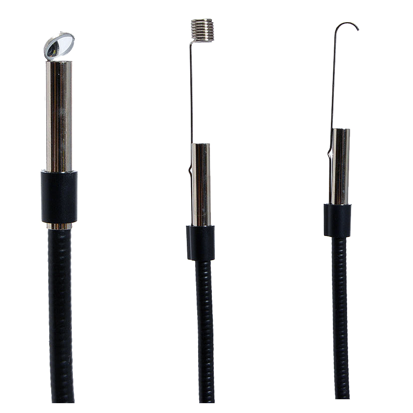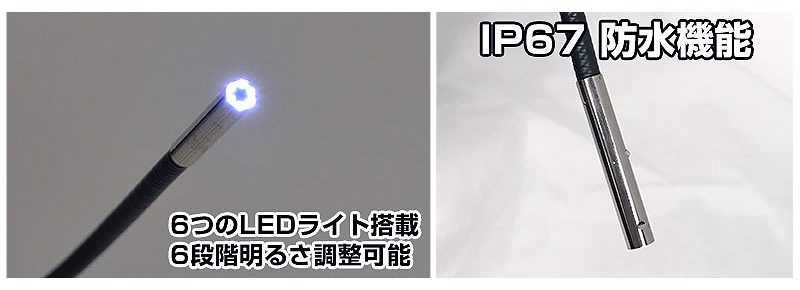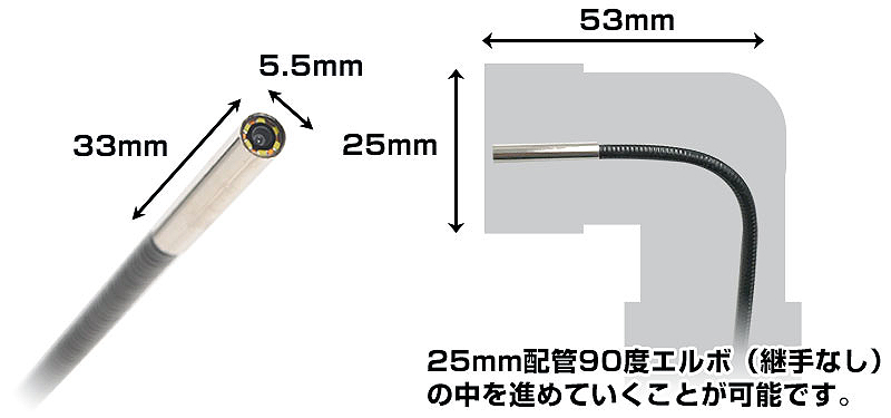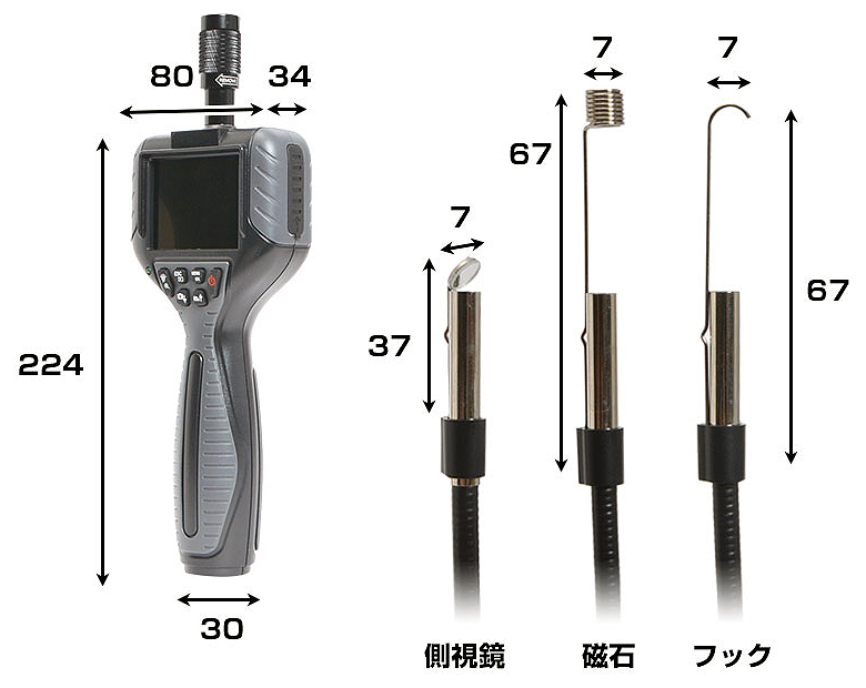 | ■特長 先端のカメラ部には6灯のLEDライトを搭載。 microSDカード(別売)への動画・静止画の保存が可能なので、リアルタイムで見る以外に、後から録画映像をチェックすることもできるので、便利に活用できます。 テレビに付属のAVケーブルで出力することで、大画面で大勢の人と一緒に観覧することもできます。 ※テレビに出力している場合は、本体液晶モニターに映像は表示されません。 ●カメラ部 先端に白色LEDライトが6個搭載されており、本体から6段階に明るさの調整が可能。また、IP67の防水機能付き。 ![]() ●カメラのケーブルは、形状記憶型のフレキシブルチューブです。 お好みの形に調節が可能です。隙間や配管にフィットし、細部の確認もスムーズに行うことができます。 ![]() ●本製品には2.7インチのカラーディスプレイを搭載。 画面を見ながら動画と音声、静止画の撮影ができ、microSDカード(別売)へ保存する事ができます。 その他180度の反転機能があるので、画面の上下を入れ替える事も可能です。 ●側視ミラー、フック、磁石の3種類のアタッチメント付き。様々な用途にご利用頂けます。 ![]() ■使用例 ![]() ■寸法図 ![]() ■付属品 ![]() ■仕様