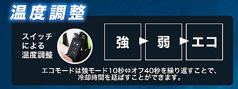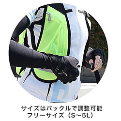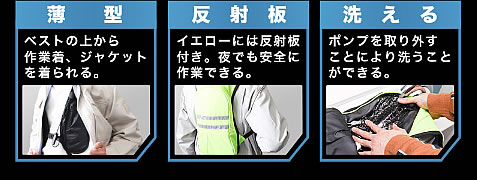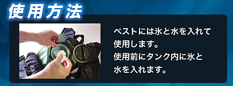 | ■上半身を水冷で冷やす「水冷循環冷却充電式クールベストライト」 氷と水をリュックの中のタンクに入れ、電源を入れると、ポンプで氷水がベスト内を循環します。 空冷式の作業着のように外気温に左右されることもなく、どんなに炎天下でも確実な冷却性能を発揮します。 水冷循環冷却充電式クールベストライトは従来の水冷ベストの弱点であった、冷気の持続時間の問題を解決。炎天下でも抜群の冷却性能を発揮します。 エコモードを使用することで、外気温との差-10℃を180分間以上持続させることができます。 また、外気温から-7℃に冷却を維持できる時間は240分間と、長時間の作業でも冷却性能を維持します。 一作業するのに十分な時間、冷却を持続することが可能です。 ![]() ![]() ■特長 ●氷水を循環させて体を冷やす 氷水がベストの中を駆け巡るので、着るだけでひんやり爽快! 氷水が駆け巡ることにより、着用から15分で体の水冷循環冷却充電式クールベストライトがあたっている部分の表面温度が2℃下がります。 すぐに体がひんやり楽になることを実感いただけます。 ※室温26℃、着用15分後のベスト胸あたりの体表面の温度が-2℃低下 ![]() ●空冷式の作業着と比べても利点がたくさん。 空冷式の作業着では、外気の空気をファンで取り込みますので、外気温が高いと生ぬるい風が体を取り囲むことになり涼しくありません。 水冷循環冷却充電式クールベストライトは氷水が体を取り囲みますので、外気温に左右されず冷たい冷気を体感いただけます。 炎天下では特に違いを感じていただけます。 ●工事現場や屋外作業で便利な機能がそなわっています。 薄型構造となっており、ベストの上から作業着やジャケットを着ることができます。 イエローモデルには反射板が付いていて夜間の作業も安全に行なえます。 使用後は洗うことができ、いつでも清潔に保つことができます。屋外での作業に適した構造となっています。 ![]() ほかにも防護服などを着込まないといけない作業や、交通整理、バイクや自転車でのご使用もおすすめです。 高性能の静音ポンプがそなわっており、パワフルなポンプにもかかわらず、音はとっても静かです。 いろいろな場所でご使用いただけます。 ![]() ■各種機能 ![]() ![]() ![]() ●スイッチによる温度調整が可能 モードを切り替えると、氷水の循環する速度が変わり、温度調整が可能になります。 エコモードも搭載されており、自動的に電源ON・OFFを繰り返すことにより、バッテリーの消費量を抑えられます。 ●付属のバッテリーは10000mAhと大容量。 最大30時間お使いいただけます。また、お手持ちのUSBモバイルバッテリーもご使用いただけます。 ![]() ●使用方法はリュック内のタンクに、水と氷を入れることにより使用できます。 氷1kgに対して水400mLを入れてご使用ください。 例えば外出先の場合、コンビニで氷を買えば冷たさが持続します。氷を入れ替えることにより、ずーっと冷たいままで作業などが行えます。 ■サイズ ![]() ![]() ■タイプ