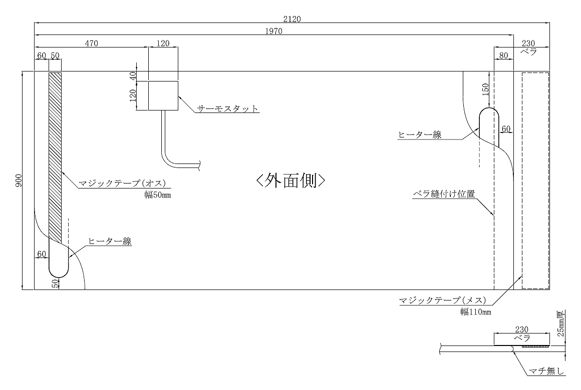■特長 ●保温材を内蔵しており周囲への放熱が抑えられ、効率的に容器を温めます。 ●マジックテープによる固定 ![]() ●付属の温度調節器 ![]() ■寸法図 ![]() ■仕様