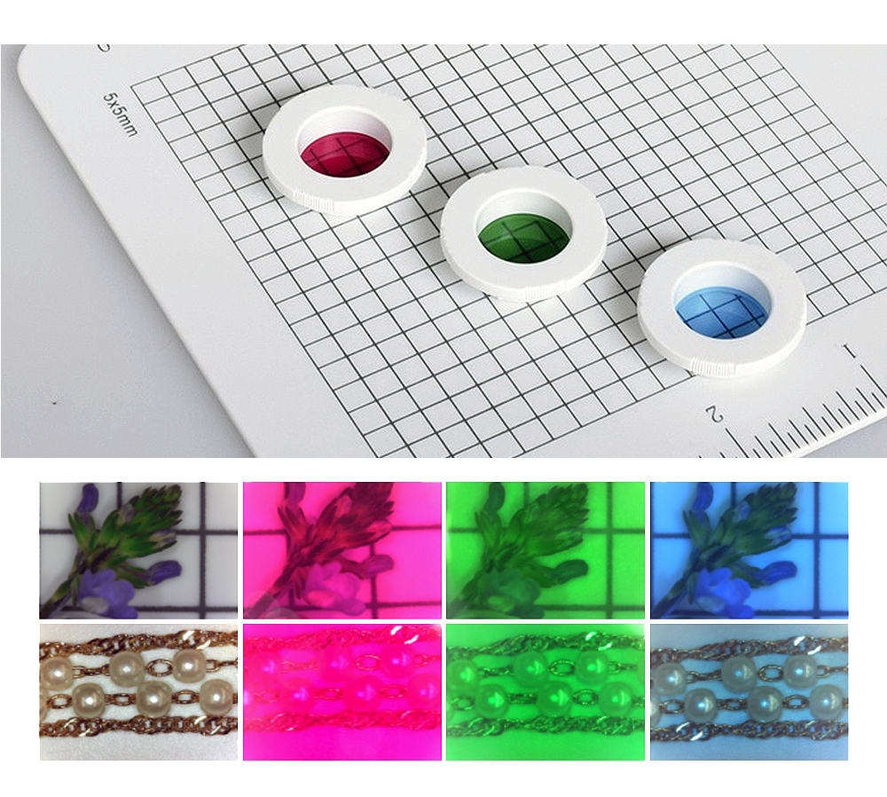 付属に赤、青、緑のフィルターが付属しており、それぞれ1個ずつ本体に取り付ける事が出来ます。