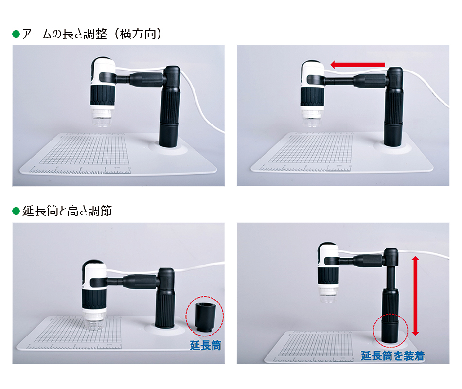アーム部の横方向は約20mmは伸ばすことができ、高さは付属の延長筒を取り付けることで約60mm~約125mmまで調整できます。