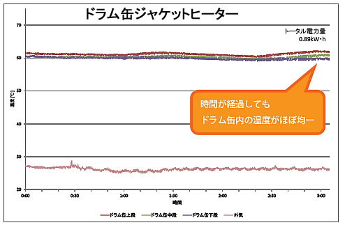 | ■特長 ●200Lのドラム缶を側面から加熱することが可能です。 ●内容物の固形化防止・粘度低下の防止が可能です。 ●柔軟で軽量なので、とても取扱いが容易です。 ●温度調節器付属しています。 ●ドラム缶表面からの放熱を抑えることができ、省エネで保温性能が高いです。 ●応用範囲が広く、工業用設備・実験研究用設備など、どの分野の設備においても利用可能です。 ■温度調節器 ![]() ■保温特性 ●保温性比較 保温状態でのドラム缶内の温度低下を、バンドヒーターを使用した場合とジャケットヒーターを使用した場合で比較 ![]() ![]() ※水200L を保温した場合 設定温度:60℃ 初期水温:60℃ 室温:27℃ ※上記データは実測値に基づいており、保障値ではありません ■仕様