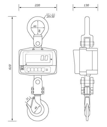 | ●あつかいやすい軽量ボディ! ボディ材質は軽くて耐衝撃性に優れたABSを採用! ●わかりやすい日本語ボタン! 機能ボタンはすべて直感的にわかりやすい日本語表記! ●バッテリー2個搭載による長時間駆動! フル充電で約120時間連続使用可能! ■特長 ●起動時ゼロ点自動調整機能 ●高輝度レッドLED表示(文字高25mm) ●軽量ボディに取り回しのよいフック ●基本機能に加え便利機能も搭載 ●内蔵充電バッテリー2個搭載により約120時間連続使用可能 ●安全型ロードセル採用 ●リモコン付属 ●わかりやすい日本語操作ボタン ゼロ: ゼロ点調整機能 風袋引き: 風袋引き機能 ●上限/下限: 上下限値チェッカー機能 重量の上限値と下限値を設定し、上限値を上回った場合と下限値を下回った 場合にブザー音でお知らせします(上下限値チェッカー機能)。 音量的には「やや大きめの目覚まし時計アラーム」というところです。 「工場内に聞こえるくらい大音量ではありません。」大音量への改造は対応不可です。 表示固定: 表示値固定機能 正味量/総量: 正味重量/総重量表示切替機能 ![]() ![]() ![]() ■外径寸法図 ![]() ■仕様
