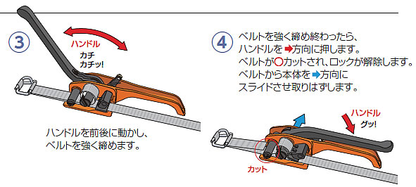 | ■特長 ●従来の木枠・ワイヤー・帯鉄・ストレッチフィルムに代わる梱包システムです。 ●廃材が少なくなり、後処理が楽になります。 ●幅広ベルトを使用するので梱包物にキズがつきにくく、また作業者も安全に作業ができます。 ●ローコスト梱包なのでワンウェイ用輸送に最適です。 ●一度締め付けた後も簡単に2度締めができます。 ![]() ■危険のおよぶ使用方法 ●吊具として使用しないでください。 ●ベルトを結んだり、ねじれた状態で使用しないでください。 ●角張った物に使用される場合は、スリーブなどの角当てをご使用ください。 ●荷締作業は足場の良い場所で行なってください。 ●締機のハンドルにパイプをつけて締めたり、足で踏んで締めたりしないでください。 ●常温で使用するように設計されていますので、80℃を超えての条件下ではご使用にならないでください ■破断強度の測定方法 ![]() ■使用例 ![]() ![]() ![]() ■金具・締機 組み合せ表 ![]() ■仕様 ![]()