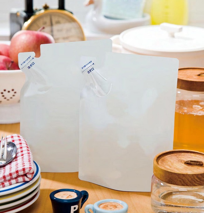 白色総ベタ印刷の注ぎ口付き詰め替え用スタンドパウチです。 自立タイプで、美しいディスプレイ効果があります。 |