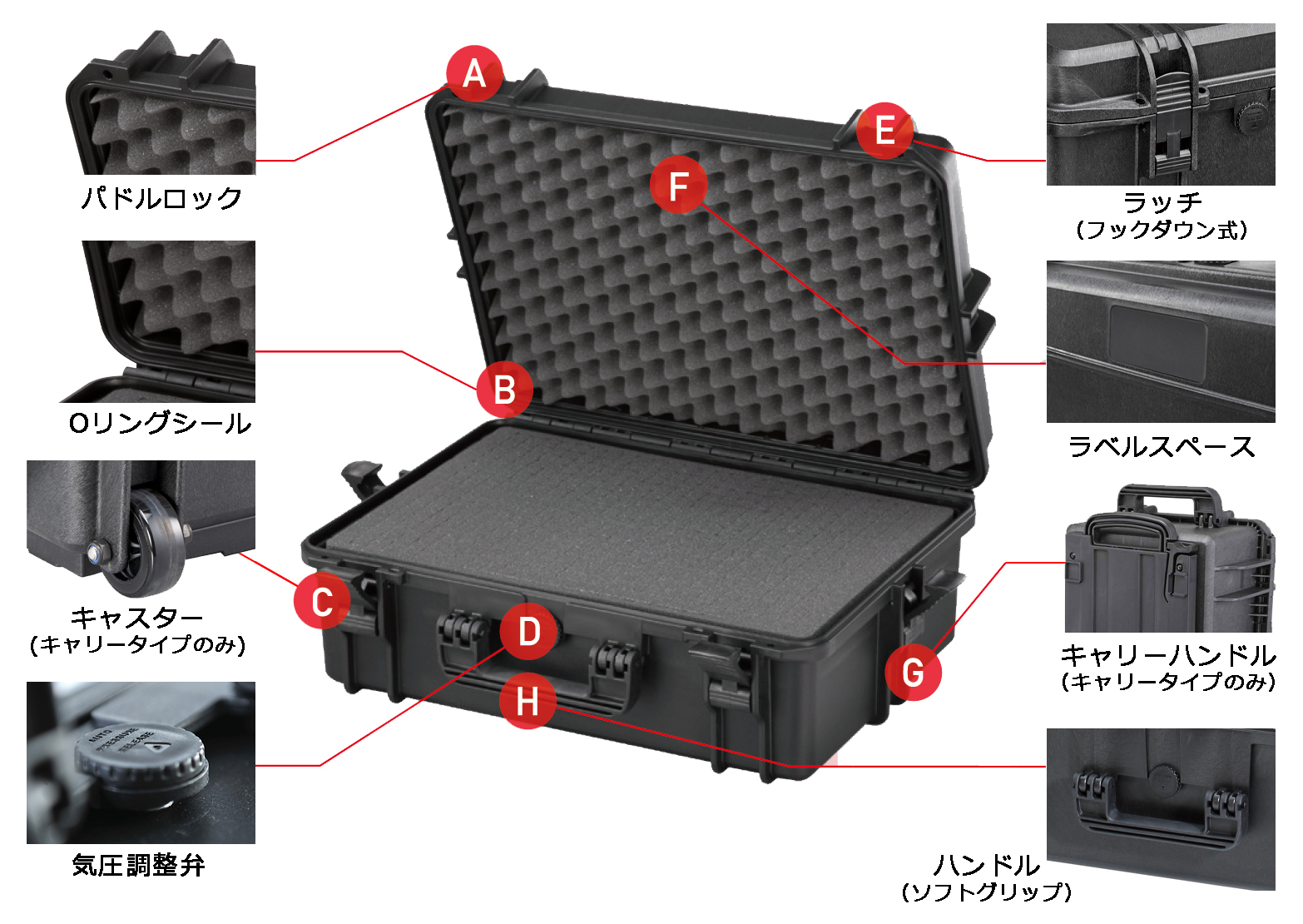 | ■特長 ●防水・防塵性 蓋側の「Oリング」が底側の突起に圧縮されることで、IP67の防水防塵性を発揮、「気圧調整弁」が内部気圧を一定にして、開閉を容易にします。 ●耐衝撃性 射出成型で作られたケースは、中間部の空洞と頑丈な外壁で構成され、リブ構造は強度を保ちつつ、外部からの衝撃も吸収します。 ●耐熱性 素材の「ポリプロピレン樹脂」は、-30℃~90℃まで耐えることができ、砂漠や寒冷地等の過酷な環境下でも使用することができます。 ●信頼性 環境規格「RoHS2」やATA規格「ATA-300-CAT1」、NATO規格「DEFSTAN81-41」など、数多くの認証試験に準拠しています。 ●各商品ウレタン付/無を選択できます。 ![]() ■各部名称 ![]() ■タイプ