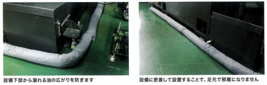 | ■特長 ●水、油、溶剤を吸収することができます ●設備下部に設置するため、足元で邪魔になりません ●周囲へ拡散する液体を囲い、吸収することができます ![]() ![]() ■仕様