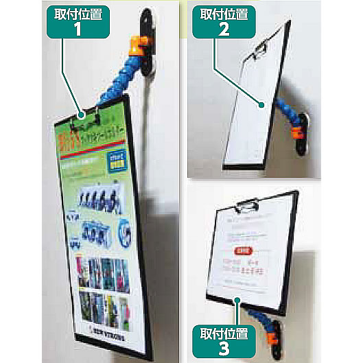 ■ご注意 ※バインダーの傾斜角が大きいと倒れ脱落が発生する可能性があります。 ※バインダー ヘ挟む資料が重たいと倒れ脱落が発生する可能性があります。 ※バインダ ー に挟んだ状態での資料・固面への書き込みは倒れ脱落が発生する可能性があります。 ※本体の取付け吸着時に指など挟まないよう、また吸着面を傷つけないよう注意ください。※電気機器(操作盤等)には、近づけないでください。 ※設置する鋼板の厚みや形状・吸着面積により、販着力が変わりズレ落ちる可能性があります。※可動部や屋外での設置は、ご遠慮ください。 |