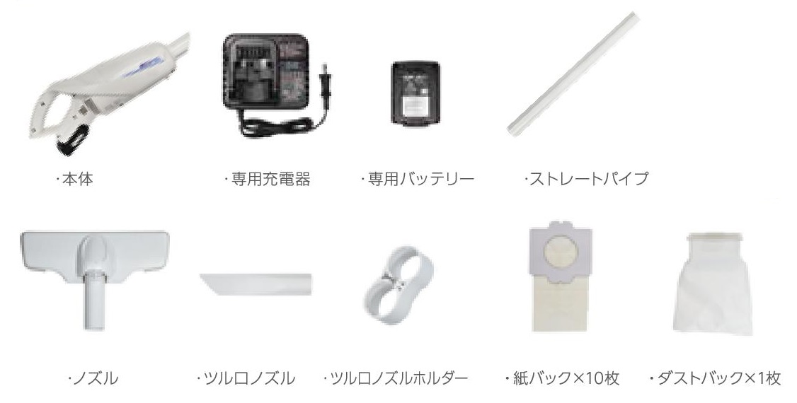 ■特長 ●軽量ボディ 本体重量1.1kgで腕にかかる負担を軽減します。 ●静かでパワフル 風の流れを工夫し、静音とパワフルを両立。24時間あらゆる環境で能力を発揮します。 ●紙バック方式採用 紙バックごと捨てられるので衛生的でお手入れが簡単です。 ●1度の充電で長く使えます 連続稼働時間約23分(LOWモード)です ![]() ■製品内容 ![]() ■製品仕様
