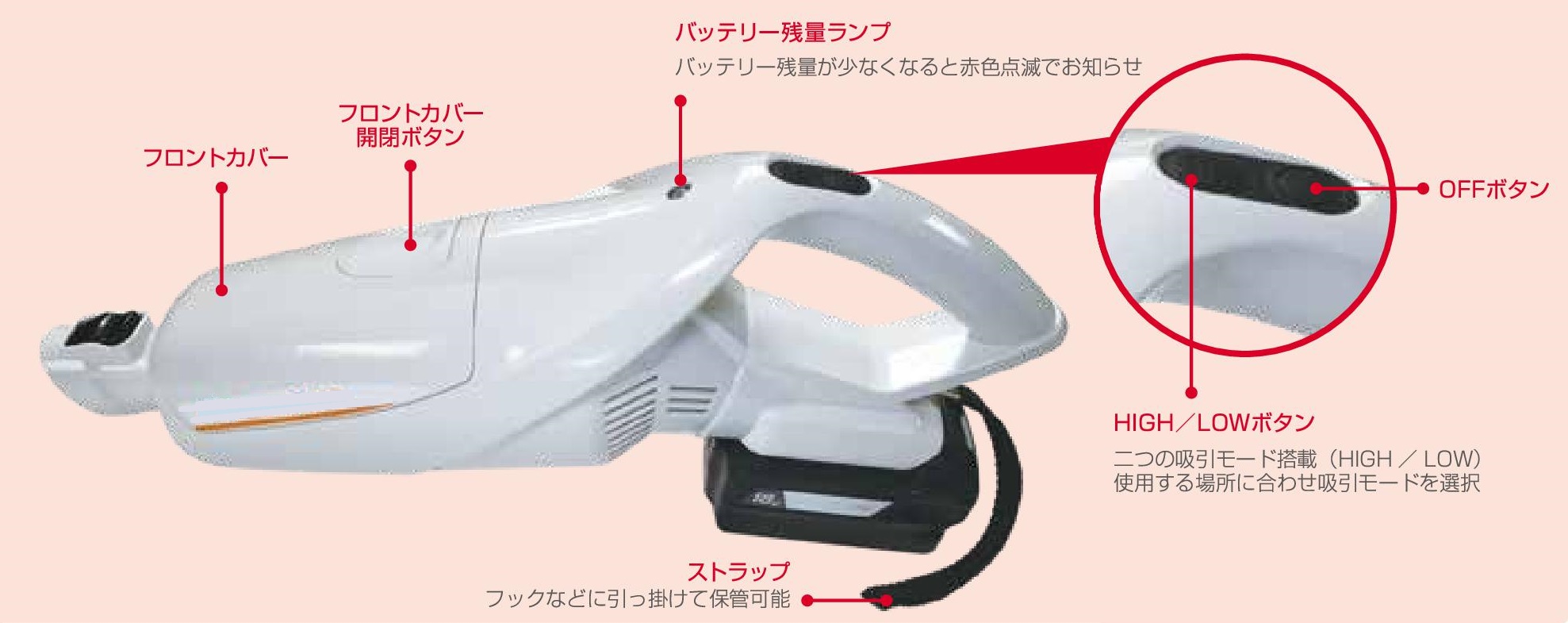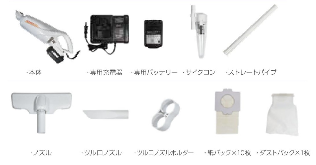 ■特長 ●サイクロンユニット 微細な粉塵などの回収に優れた分解して洗えるサイクロンユニットを搭載。ゴミによる目詰まりを防ぎ吸引力を持続します。 ●圧倒的なバキューム性能 吸引仕事率60W、細かい埃からクリップなどの重いものまで種類を選ばず回収します。 ●圧倒的な稼働時間 連続稼働時間が約50分(LOWモード時)です。 ●静音設計 空気の流れに工夫を凝らし吸引力と静音を両立した設計で使う場所を選びません。 ■各部名称 ![]() ■製品内容 ![]() ■仕様