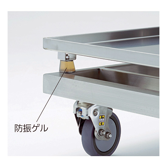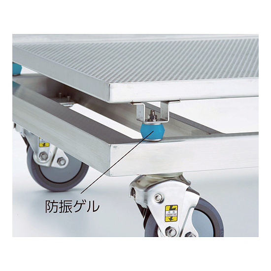 | ■特長 ●防振ゲルと振動衝撃吸収導電ウレタンキャスターを装着したSUS304製台車です。