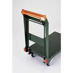 前角部にクッションゴムがあり安全です。 車輪に標準ラジアルベアリングを採用、軽く静かに動きます。 荷台面は鉄板曲げ工法にスポット溶接で製作しているため、溶接などによる凹凸が少なく、表面仕上げが綺麗で頑丈です。 ハンドルを握るとストッパーが解除されます。 |