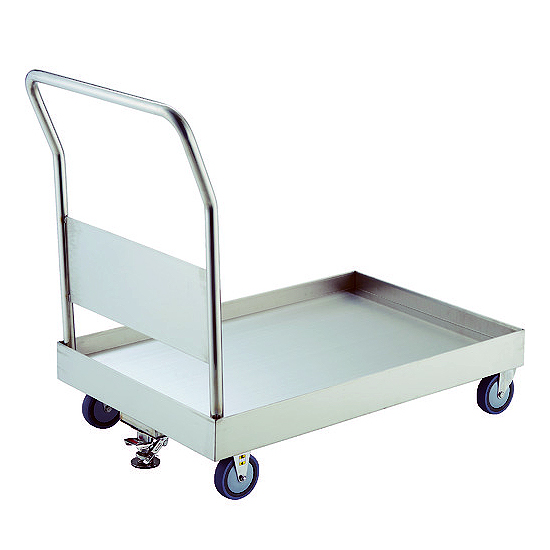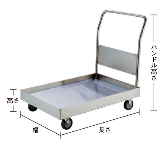 荷台部が深さ50mmのオイルパン形状のSUS304製台車です。 水漏れや荷物の落下を防止できます。 導電ウレタン車輪タイプ |