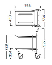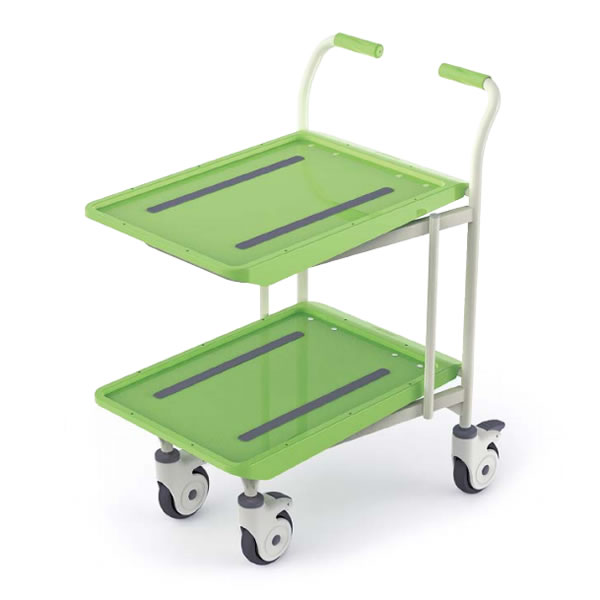 収納スペースを小さくできるネスティング機能付、軽量アルミフレーム製の2段式カートです。 下段部が床から300mm以上離れているため衛生的です。 天板はすべり止め付き。 |