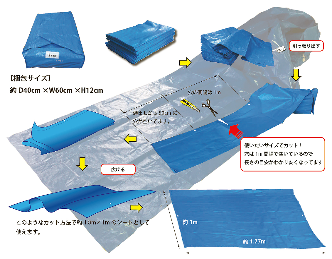 | ■特長 ●ハトメナシートの長尺物で巾方向3つ折り、長さ方向アコーディオンたたみで、長さ方向の穴の間隔約1m。用途によって任意の長さでカットして使えるので無駄が少なくてすみます。 ●使用の際は動かさないで外装から必要な数量だけシートを引き出して使えるため便利! 備蓄や保管にも場所をとらずコンパクトに収納できます。 ●アコーディオンたたみで紙管に巻いていないため、使い切った後に紙管を処分する手間がかかりません。 ●リサイクルする場合でもハトメや異質の PP ロープも使用していないため廃棄や焼却の場合も分別する手間が不要です。 ![]() ●ライトバンに積めないサイズのロール原反と同様の平米数量が、この商品ならコンパクトに積載可能。 ![]() ■用途 建築床養生、壁面養生、短期野積みカバー、イベントシート、梱包材、防災用の備蓄、雨風雪除け、間仕切として使いたいサイズでカットして使える。 ■仕様