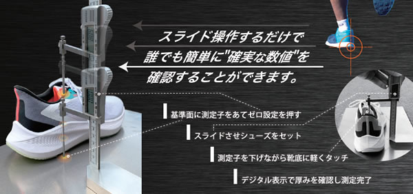 | ■ソールの厚さを正確に簡単に秒速測定!! M2611ZS-101KTは靴底の厚さを誰でも簡単に測定できる測定器です。 組み立て不要のスタンド型で設置作業も簡単です。 シューズの種類も中敷などの挿入物を含むものからハイカットシューズまで対応できます。 靴底にスライドしながら測定子をあてるだけなのでブレて測定値が変わることも少なく 初めての方でもすぐに測定作業が行えます。 ![]() ■測定器 軽量で持運びに便利なスタンド型の測定器です。 測定子:70mm ケース付き ![]() ■測定台 地面や安定しないベンチの上でも測定台を使うことで正しく測定器を設置することができます。 サイズ400×280×6mm ![]() ■ハイカット用測定子 通常の測定子より70mm長くハイカットシューズを測定するのに適しています。 測定子(ネジ部含む):140mm ※測定子の付け替えはネジ式のため簡単に行えます。 ![]() ■測定について 正確に測定するために測定台または平らな場所に設置して測定を行ってください。 1.電源を入れる --測定器の「ON/OFFボタン」を押し電源を入れます。(①) 2. --測定器をテーブルなどの平らな台の上に設置して測定子を基準面にあてて「ゼロ設定」ボタンを押します。(①)(ゼロ設定後は連続で測定できますが定期的にゼロ値が正しいかご確認ください。) 3.シューズを設置する --スライド部をつまんで上に移動させます。(②) --シューズのかかと中央部が測定子の下にくるようにセットします。(③) 4.厚みを測定する --スライド部を下げ軽くシューズの靴底に測定子をあてます。④ 5.数値を確認する --デジタル表示部で厚みの数値を確認します。⑤ ![]() ■寸法図 ![]() ■使用例 ![]() |