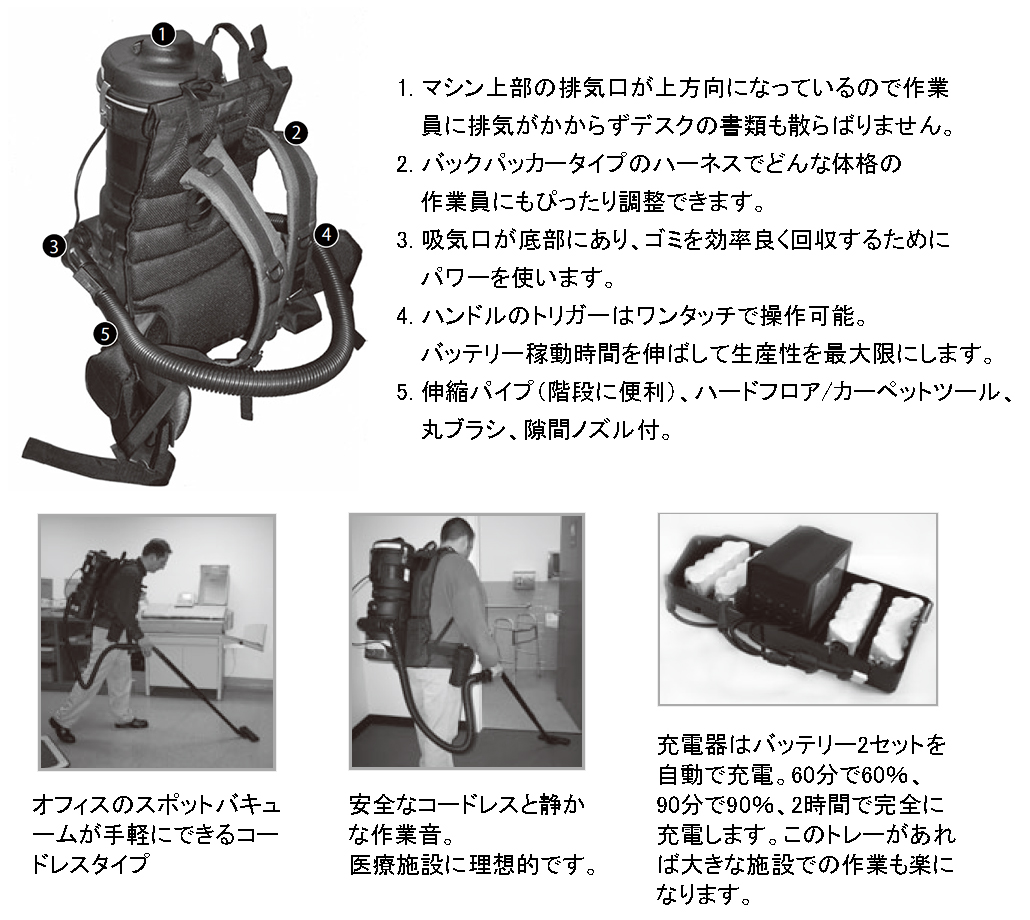 | ■特長 ●圧倒的な生産性を可能にするワンタッチトリガーとコードレスデザイン(最大2,790㎡/1時間) ●NiMHバッテリー技術で従来のバッテリーの2倍の電荷密度。各バッテリー一式当たり最大2時間駆動します。 ●全ての作業員に快適にフィットする人間工学設計のハーネス。肩、胸、ウェストでぴったりに調整できます。 ●0.5HP、2段階、24Vのバキュームモーターで強力にバキューム。 ●65dbAの静かな作業音。利用者がいる場所でも清掃作業が行い易い設計です。 ●転倒事故を防ぐコードレスデザイン。事故やマシンの破損を防ぎ修理コストを軽減します。バキュームマシンで一番摩耗すると言われるコードがないので、修理の頻度を減らして長くお使いいただけます。 ![]() ■仕様