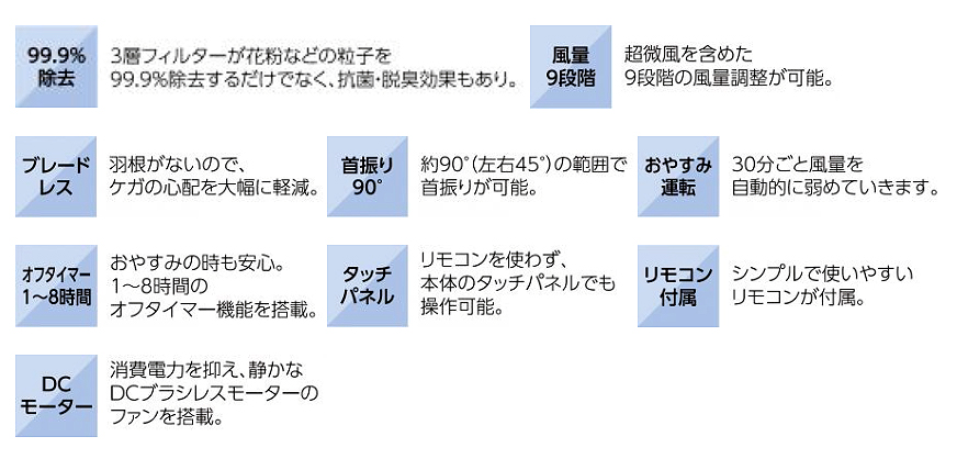 ●3層フィルターで空気をしっかり清浄。花粉などの粒子を99.9%除去 ●ツイン効果による「まろやかな風」で疲れにくい。 ●「超微風」で快適なおやすみを。おやすみタイマー機能も搭載 |