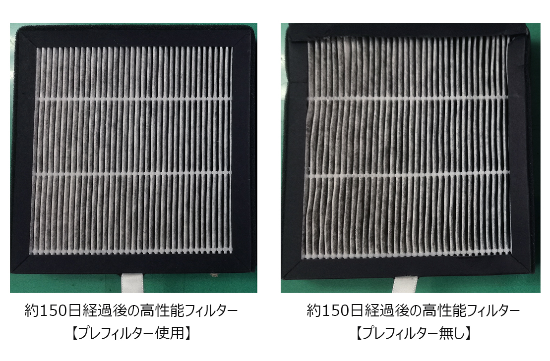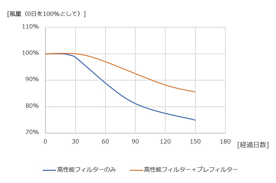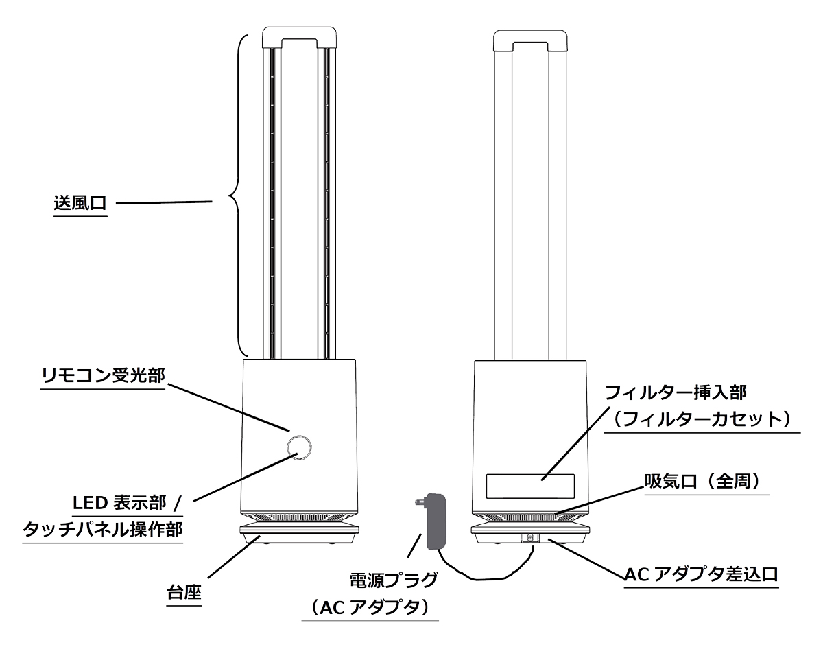 | ■特徴 ●3層フィルターで空気をしっかり清浄 3層フィルターで空気をしっか清浄、花粉などの粒子を99.9%除去します。 また、プレフィルター方式の採用で、高性能フィルターの交換が2年に1回でOKです。(※使用環境によります) ![]() ●本体にフィルターユニットを内蔵 ![]() ●「まろやかな風」で疲れにくい ツイン効果により「まろやかな風」を実現し、長時間、風にあたっていても疲れにくく感じます。 また、超微風な設定も可能で快適をコントロールすることも可能です。 ●プレフィルター採用で、高性能フィルターの交換が2年に1回でOK。 高性能フィルターは、しっかり空気中の汚れをキャッチしてくれますが、その反面、フィルターに汚れが付着して送風の風量が少しずつ落ちていきます。 多くの一般的な空気清浄機能付きファンは、高性能フィルターを年に1回、交換するように推奨しています。 本製品はプレフィルターを使用することで、高性能フィルターを長持ちさせ、2年に1回の交換ですませることができ、フィルター交換の費用を抑える事が出来ます。 ![]() 上のフィルターの画像は、約150日経過後のプレフィルター有り・無しの高性能フィルター の比較です。 画像からは違いが分かりにくいですが、ファンの送風風量を測定した下のグラフからは、150日経過後に風量の差が約10%生じています。 ![]() ●シンプルなリモコンが付属されています。タッチパネルでも基本操作が可能です。 ![]() ■機能一覧 ![]() ■寸法図 ![]() ■各部名称 ![]() ■タイプ
