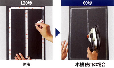 時間が大幅に短縮 ゴミがでず、後片付けも簡単 ●剥離紙を自動で巻き取り ●50M長さの専用テープ ●2種類の両面テープをご用意(汎用/低VOC) |