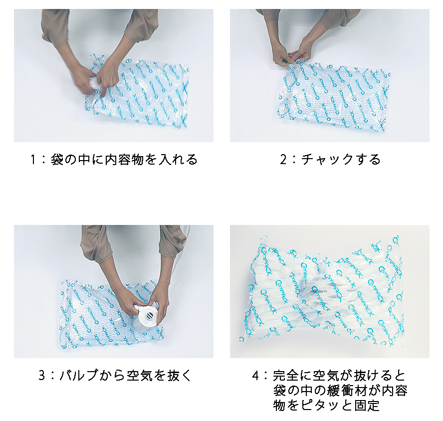 | ■特長 ●コンパクト 空気入り緩衝材や発泡材など嵩張る緩衝材も空気を抜くのでとてもコンパクトになります。体積で値段がきまる運賃のコスト削減や保管時の省スペースに効果的です。 ●リターナブル 袋の開閉がスライダ―付きチャック方式なので、袋が破れたりチャックが壊れない限り、繰り返し何回でも使えます。通い箱代替や、あなたの大事なカメラ部品などの持ち運び用緩衝材に。 ●外部空気を遮断して防錆&酸化抑制 外部空気を遮断して防錆&酸化抑制袋の中の空気を抜いてしまうので、金属製品の錆の進行を防ぐ防錆効果や内容物の酸化劣化を防ぎます。ホコリやゴミの侵入や水濡れも防ぎ安心して輸送・保管できます。 ■使用方法 袋の中の空気を抜くことでインサートされている緩衝材(空気入り緩衝材や発泡シート)が内容物をピタッと固定してコンパクトに緩衝します。 ![]() ■使用用途 ●工業部品の輸送・保管用途 ・機械のパーツ部品を次工程の組み立て工場などに送る際の工場間移動の通い箱代替として ・ サイズが同じなら部品形状が変わるたびに専用通い箱を作るコストの削減に ・ 複数のアッセンブリー部品を一つのコンパックにまとめて包装可能 ・ 透明袋+空気入り緩衝材仕様なら包装の上から内容物の確認もOK ・ 錆びやすい機械予備部品の保管・輸送用途に。これまで施していた錆止めオイルが不要になってトータルコストの削減も ・ 一点一様の試作品を急ぎ航空便で送る時には、梱包が簡単&箱が小さくなって送料のコストダウンに ●趣味の大切な道具の保管・持ち歩き時に ・ カメラのレンズやこだわりの釣りのリールなどあなたの大切な趣味の道具の保管、アウトドアへ持ち出し(雨や泥、潮風にさらされる心配がない) ・ 料理が趣味の方のこだわりの包丁や趣味のナイフなど(安全に保管し持ち歩けます) ・ 専用のケースや買った時の箱がなくなってしまった楽器やカメラを中古市場で売買する時の輸送包装手段 ●お酒や民芸品などのお土産に ・ ガラス細工や瀬戸物などの伝統工芸品を持ち帰る時にもお勧めです。 ・ スーツケースに入れるお土産のワインや日本酒の瓶 など・・・ ■サイズ ![]() ■緩衝材