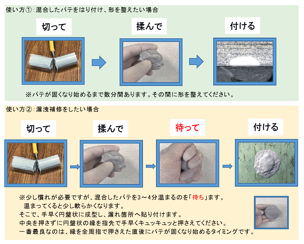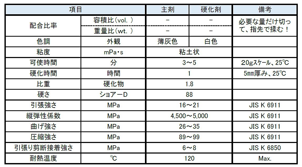 ■用途 金属全般、コンクリート、タイル、石こうボード、石材、木材への肉盛り作業や穴埋め作業、造形作業 ■時間 可使時間:3~5分 硬化時間:1時間 ■使用方法 ![]() ■タイプ