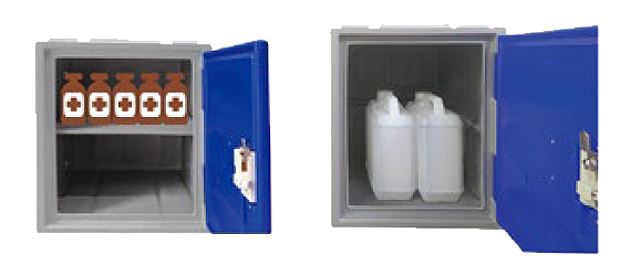 ■特長 ●頑丈 ハンマーで叩いた位では割れにくい「耐衝撃性ポリエチレン」を使用。非常に頑丈な一体成型ですので、キャビネット上部はワークスペースとしても使用可能です。 ●組み立て不要 一体成型のため、組み立ての手間がありません。部品点数も少ないので、メンテナンスも容易です。 ●丸洗いOK プラスチック製のため、丸洗いが可能。清潔にご使用いただけます。 ●屋外OK 防湿・防蝕・防錆に優れ、屋外や湿気の多い場所でもご使用いただけます。 ●カギ付き ![]() ●レイアウト自由 左右・上下に連結可能。スペースに合わせて設置いたします。 ![]() ■使用例 ![]() ![]() ■タイプ