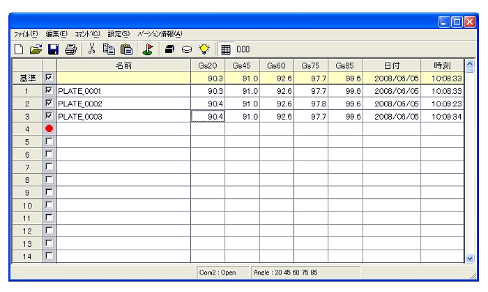 設定した角度の光沢度、光沢差、名前、メモ、測定日