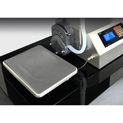 ●計量台の上にボトルを置き、「Tare」キーを押して空になったボトルの風袋引きを行います。「Run」キーを押して充填をスタートさせ、充填された液体の重量が設定された充填重量に達すると自動停止します。