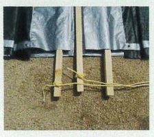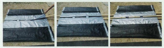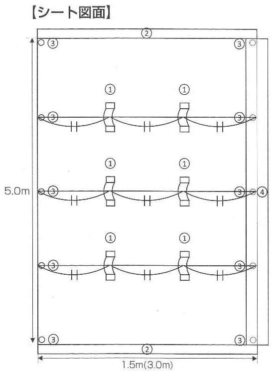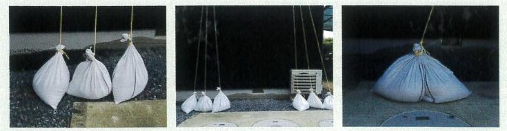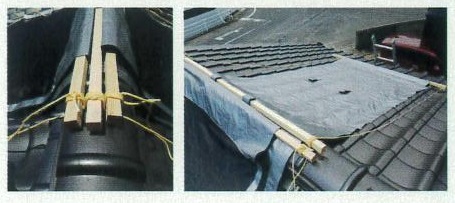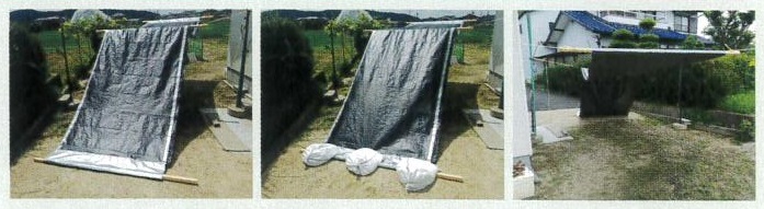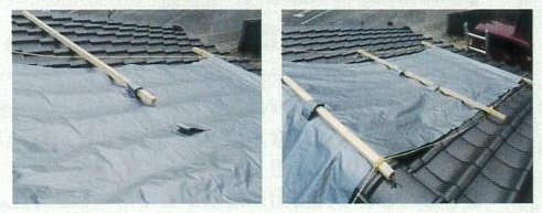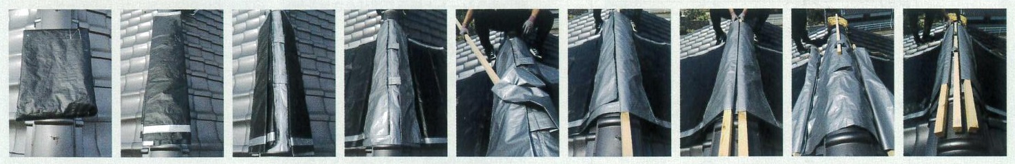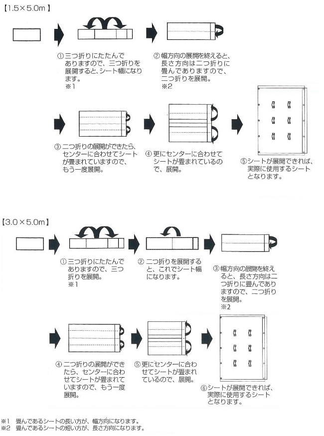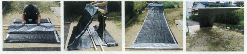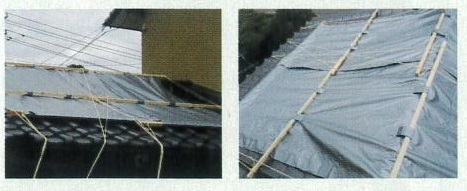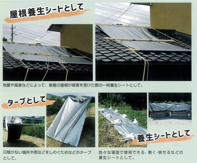 ■特長 ●高所作業時間短縮 高所での作業は約1〜2時間。※シート1枚を張る場合。(メーカー比較) ●高所重作業を削減 おもりを高所に設置する必要がありません。 ●シートを簡単に展開 あらかじめシート本体を展開し易いように畳んであります。 ●シートを面で固定 シートの押えは、面で押えられるようにしてあるので、風に煽られにくい。 ■使用用途 ![]() ■タープ施工手順 あらかじめ設置する場所の安全確認をしてからご使用ください。 (1)シートを展開する 下部の「シートの展開」を参照し、シートを展開する。 ![]() (2)シートに角材を通す シート両端の袋状2箇所とシートセンターのベルトループに、角材を通す。※角材がない場合には、ロープで代用可能。 ![]() (3)ロープを結ぶ シート本体の袋状1辺とシートセンターに通した角材の両端に、ロープを結びつける。※ロープを通した場合は、結ぶ必要はありません。 ![]() (4)シート取り付け (3)でロープを結んだ袋状1辺を持ち、写真のようにシートを引くと、タープ上面となるブラック面が出てきます。手で引いた1辺は前側となりますので、ここで前側となるロープ2本を高い場所へ結び付ける。また、センター部に角材と結んであるロープ2本も同様に高い場所へ結びつける。 ![]() (5)おもりを乗せる 何も固定していない1辺におもりを乗せて設置完了。 ![]() ![]() ■屋根養生施工手順 作業は高所作業となりますので、労働安全衛生法等関係法令に則り、周囲の安全確保をした上で作業を行ってください。 1.屋根の上でシートを展開し、角材を通す 覆いたい箇所の上部(棟)にシート中心を合わせる。下記写真のようにシートを展開し、両端となる袋状の2箇所とセンター箇所のベルトループへ角材を通す。※シート本体は展開しやすい様に畳んでありますので、施工場所では一度に展開しないでください。 ![]() 2.ロープを結ぶ 通した角材の両端へロープを結び付ける。ロープを結び終えたら、角材を通した側を軒先に向かって垂らしていく。シートを垂らし終えたら、ロープは地面へ下す。この作業は袋状2辺とも行う。※ロープを結びつける際には、ロープが解けたり・外れたりしないように十分注意してください。 ![]() 3.角材を通す シート本体中央に付いているベルトループへ角材を写真のように通す。2.と同様に角材両端ヘロープを結びつける。結び終えた後は、2本のロープを地面へ下す。反対側も同様に作業を行う。 ![]() 4.おもりをつけて固定する 屋根から垂れているロープとおもりを弛みなく外れない様にして、全て固定ができれば作業完了。方側を固定時に強く引っぱりすぎると、残る方側が引っぱられた方へ寄ったり、資材等の落下原因になる可能性がありますので、ご注意ください。 ![]() 5.シートの連結 覆いたい箇所に対してシート幅が足りない場合には、シートをつなげてご使用ください。 ![]() <ご注意> 本商品を使用する際の資材は、平時は小売店や量販店などで準備できますが、被災時は改めて用意をすることは容易ではありません。災害が起きてから用意するのではなく、予め準備をしておくことをお勧めします。また、この商品に限らず、災害に対しての準備(備蓄)は自分自身で行い、必要と思うもの・考えられるもの(飲食に限らず、常備薬等々)を必要分(従業員・家族・要介護者など)準備することをお勧めします。 ■仕様