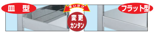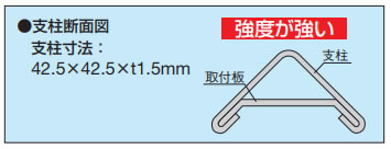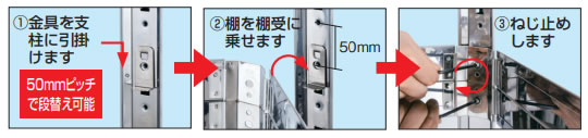 | ■支柱突き合わせ方式 ●簡単に組み立て・段替えができます。 棚板は棚受に乗せてビス止めするだけの為、従来2人での作業が1人で簡単に取付け、また組み替えができます。 ![]() ![]() ■支柱構造は溶接レスにより美観向上 ![]() ■棚板は皿型・フラット型変更可能 ![]() ■直進安定金具を標準装備 ![]() ■仕様