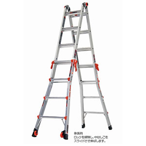 | ■伸長時 ロックを解除し、中はしごをスライドさせ伸ばします。 ![]() ■キャスター付で移動に便利 ![]() ■壁面での作業に便利な90°ポジション ![]() ■はしごとして ![]() ■タイプ