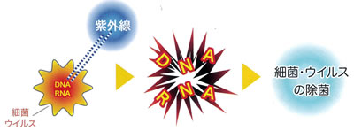強力な紫外線で、室内の空気を除菌します。 紫外線による除菌は、細胞を司るDNAやRNAに直接作用し不活化させる原理のため、細菌やウイルスが突然変異した場合においても効果が期待できる除菌手段です。 |