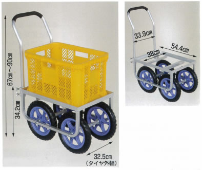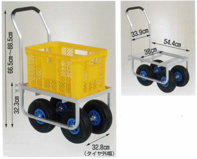 ■コンテナ1個用 大きいタイヤ仕様(M453H-500-35TH・M453H-500-35NH)![]() ・タイヤの直径が約25.4cm、幅が約8.2cmと大きいため、悪路での走行に最適です。 ・ハンドルが上下に伸縮できますから、作業に合わせ調節できます。 ・ハンドルは4ヶ所のネジでしっかり固定していますから上部です。 ●仕様