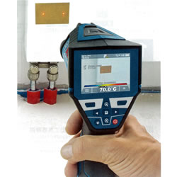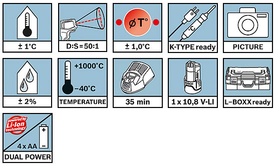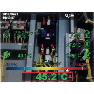 | ■特徴 表面温度と周囲状況の正確な測定・記録保存が可能 ・内蔵のカメラが即座に測定値を写真で表示して記録 ・専用アプリを使用してBluetooth経由でデータを転送し、高品質の記録をカンタンに保存・転送可能 デュアル電源供給システムにより10.8Vリチウムイオンバッテリーまたは標準アルカリ乾電池を使用可能 無線放射温度計データーロガーは、表面温度と周囲状況を正確に測定して記録します。 内蔵のカメラが測定値を写真に記録します。 専用アプリを使用して、Bluetoothを介してデータを直接スマートフォンに転送でき、高品質の記録をカンタンに保存・共有することができます。 デュアル電源供給システムにより、10.8Vリチウムイオンバッテリーまたは標準アルカリ乾電池を使用できます。 成形リスクの測定、ヒートブリッジの点検、過熱したヒューズの特定など、ユーザーの様々な用途に最適測定センサーは、表面温度を測定して、かつ周囲の温度と相対湿度を正確に測定します。 直感的な操作を可能にする、わかり易いユーザーインターフェースを採用し、-40℃~1000℃の広い測定範囲で高精度の結果を提供します。 ![]() ■測定モード