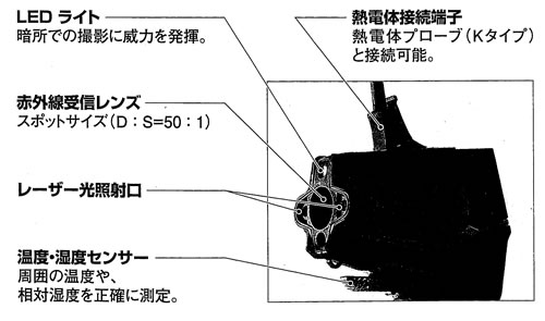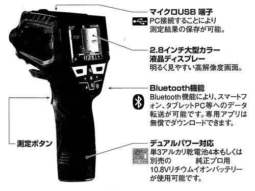 赤外線受信により物体表面温度を非接触で測定 露点温度の算出・熱橋の検出・熱電対プローブ対応 Bluetoothでスマートフォンタブレットに、マイクロUSBでPCに接続することができ、測定結果の保存、転送が可能です。 |