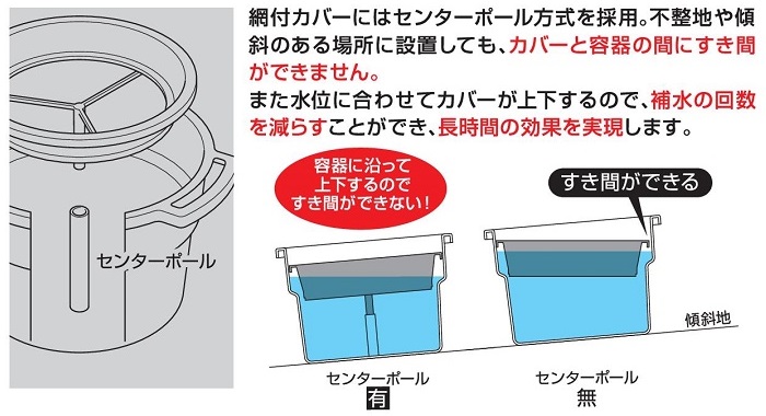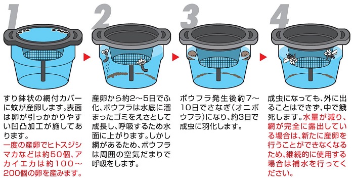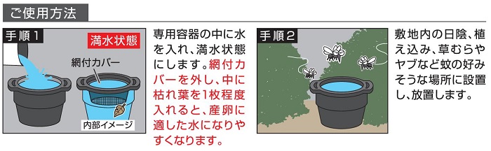 薬剤・電気不使用の環境にやさしく、二次的な被害も起こらない、蚊の発生を減らす容器です。 |