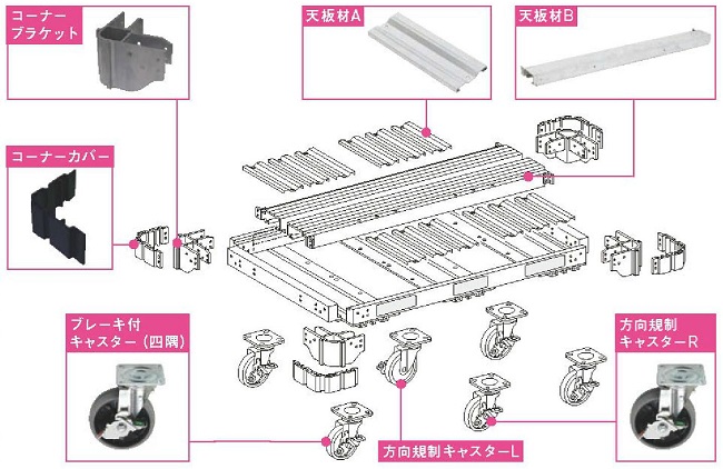 最大1トンの積載を可能にした平床台車、建設資材の運搬に最適です。 保管時は台車の積み重ねができで収納場所をとりません。 コーナーカバーにより壁などへの衝突時にできるキズを軽減します。 床に跡が残りにくいΦ150のウレタンキャスターを採用しました。 |