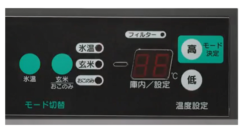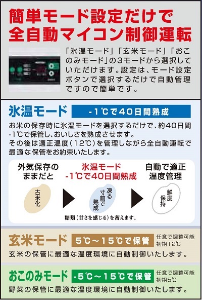 | ■特長 玄米を未凍結温度領域(0℃~マイナス1℃)で、一定期間熟成させる事により、玄米に含まれるデンプンを分解し、人間が甘みを感じるブドウ糖や果糖などの糖類を蓄えることで、美味しさを熟成させます。 ●簡単操作で氷温熟成 ●冷めてもお米がパサつかず、再熟成で旨みが回復します ※詳しくはカタログ2ページ目Q&Aをご覧ください ●シンプルで見やすい大型操作パネルを採用 ![]() ●庫内設定温度-5℃~15℃まで設定可能 ●送風ユニット ![]() ●大型取手を採用することで開け閉めが楽になりました ※南京錠用金具付き ※移動に便利なキャスター付き ※高さ調節アジャスター付き(調整幅:20mm) ![]() ■仕様