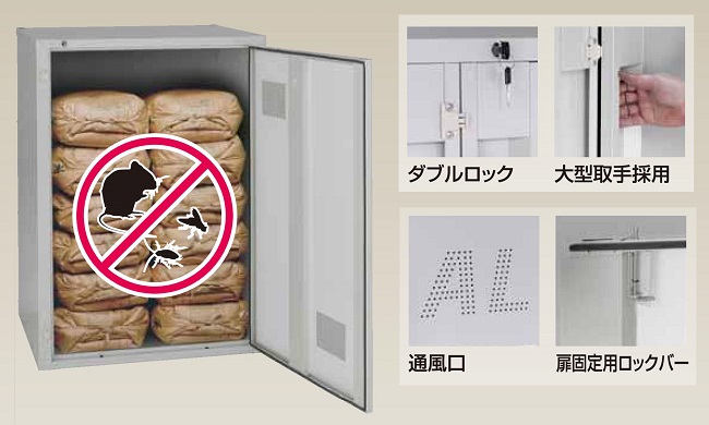 | ■特長 おいしいお米を外敵から守る。 精魂込めて収穫した自慢のお米をネズミ・害虫や結露・湿気など外敵から守り侵入を防止。 ●庫内底面超堅牢構造 ●外装は高級感のある仕上がり ●ネズミ、害虫や結露、湿気の侵入を防止 ●扉内側には密封性に優れたパッキンを使用 ●内面には全面結露防止材を貼り付け ![]() ■仕様